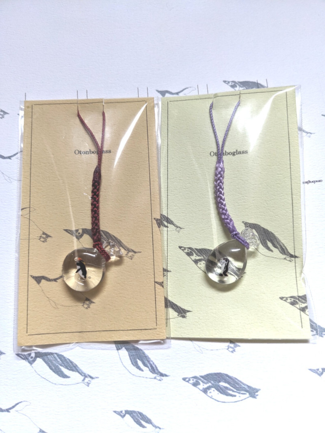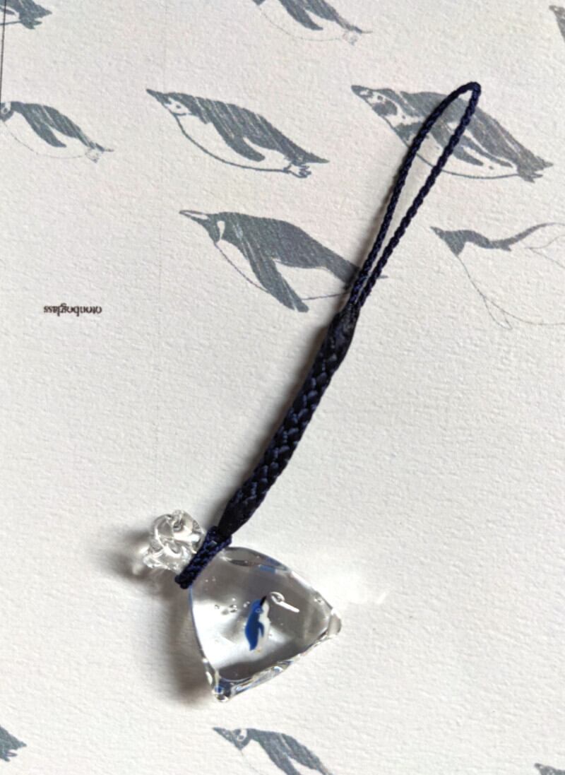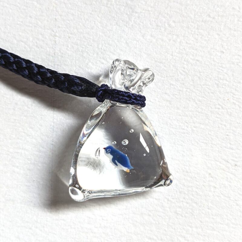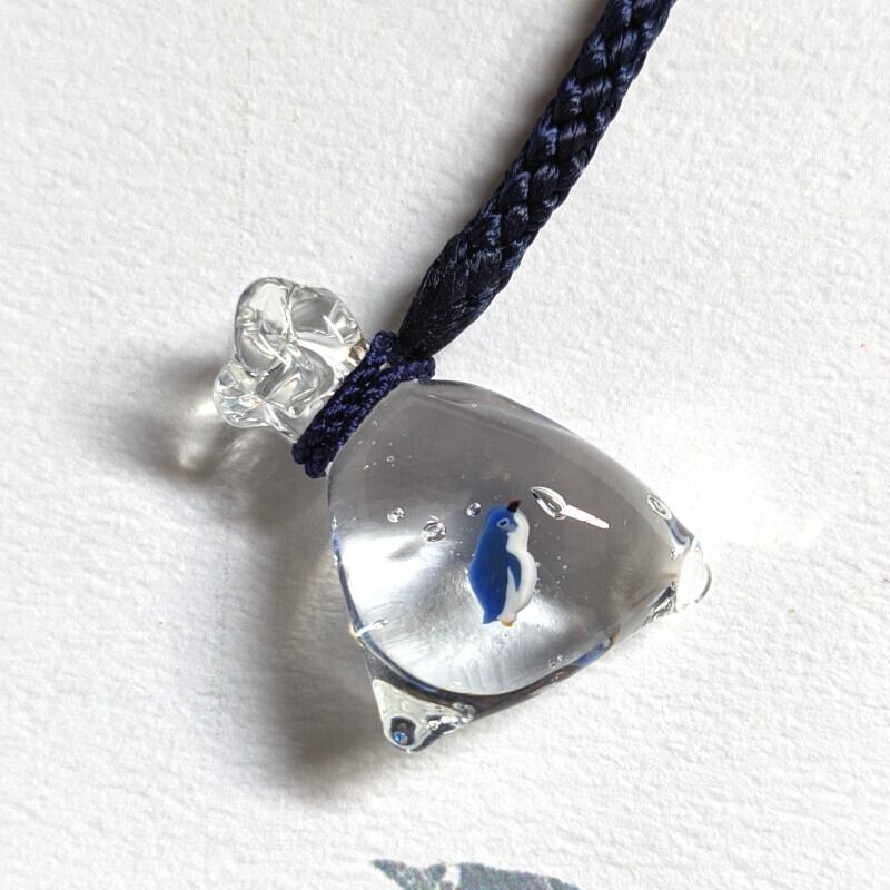 ペンギンを、金魚すくいの袋に入れたような形の根付です。